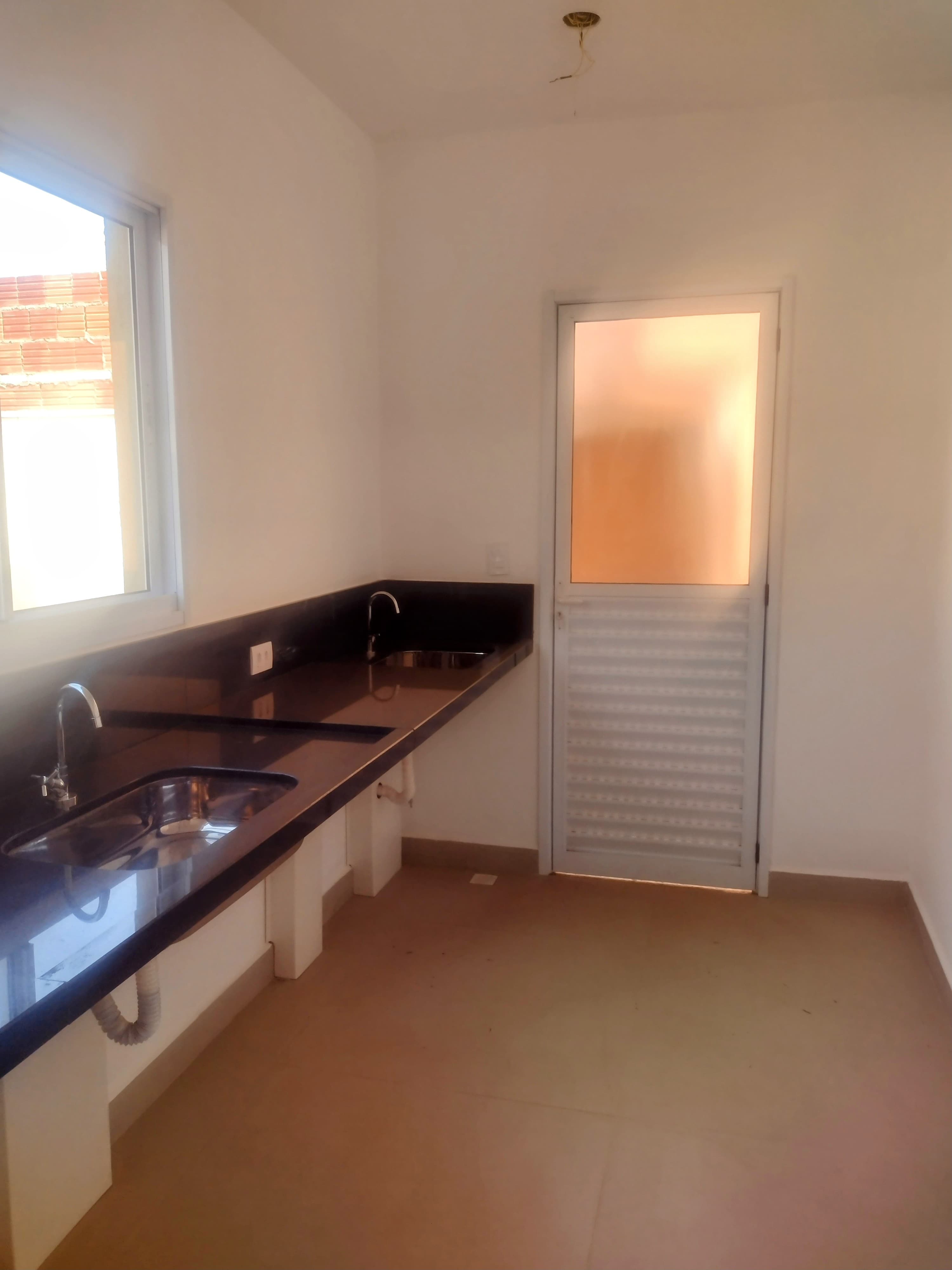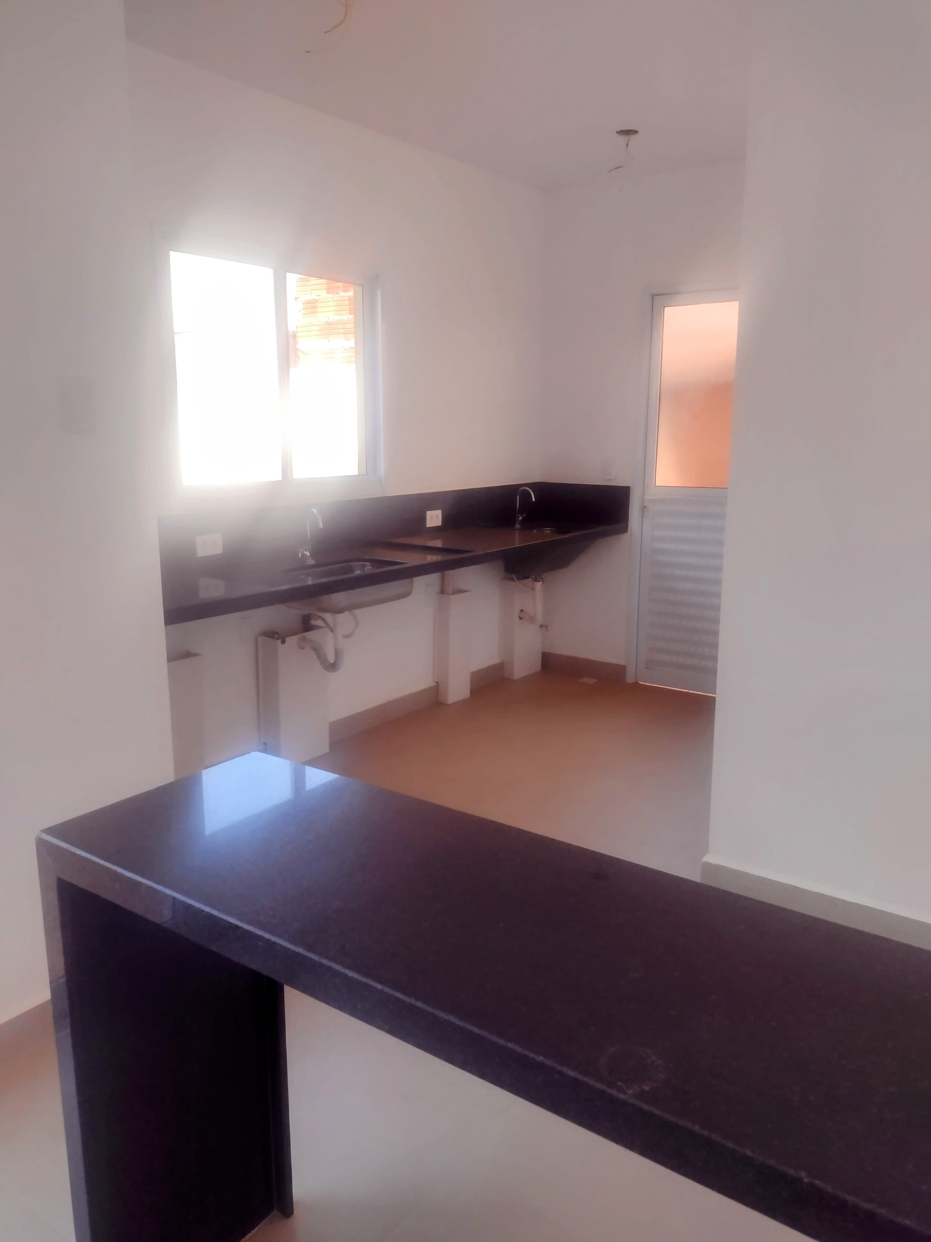 cozinha ampla com bancada de mármore, pedra para futura instalação de cooktop;