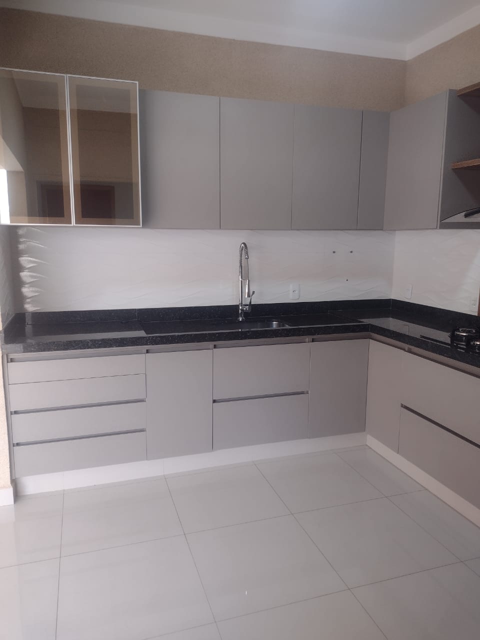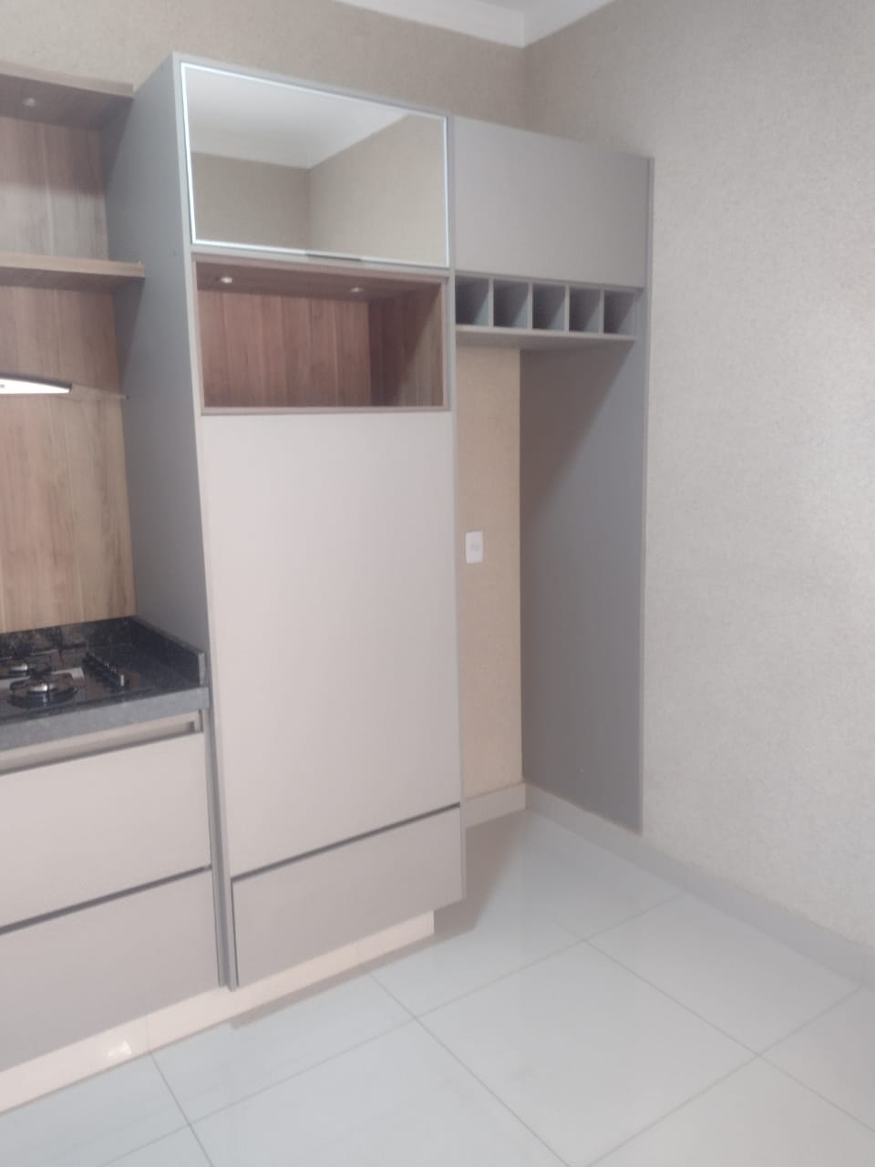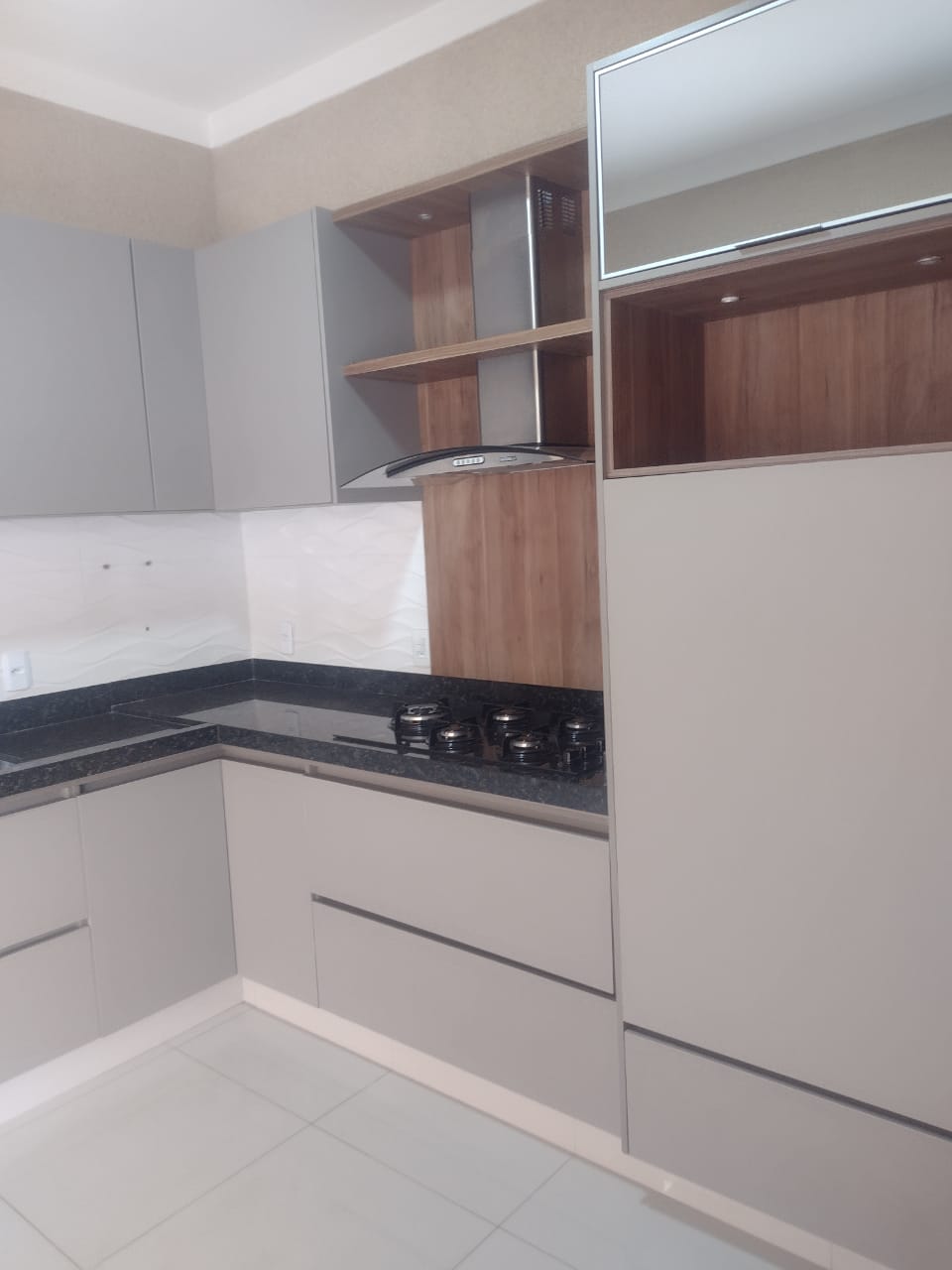 cozinha planejada com cooktop e exaustor;