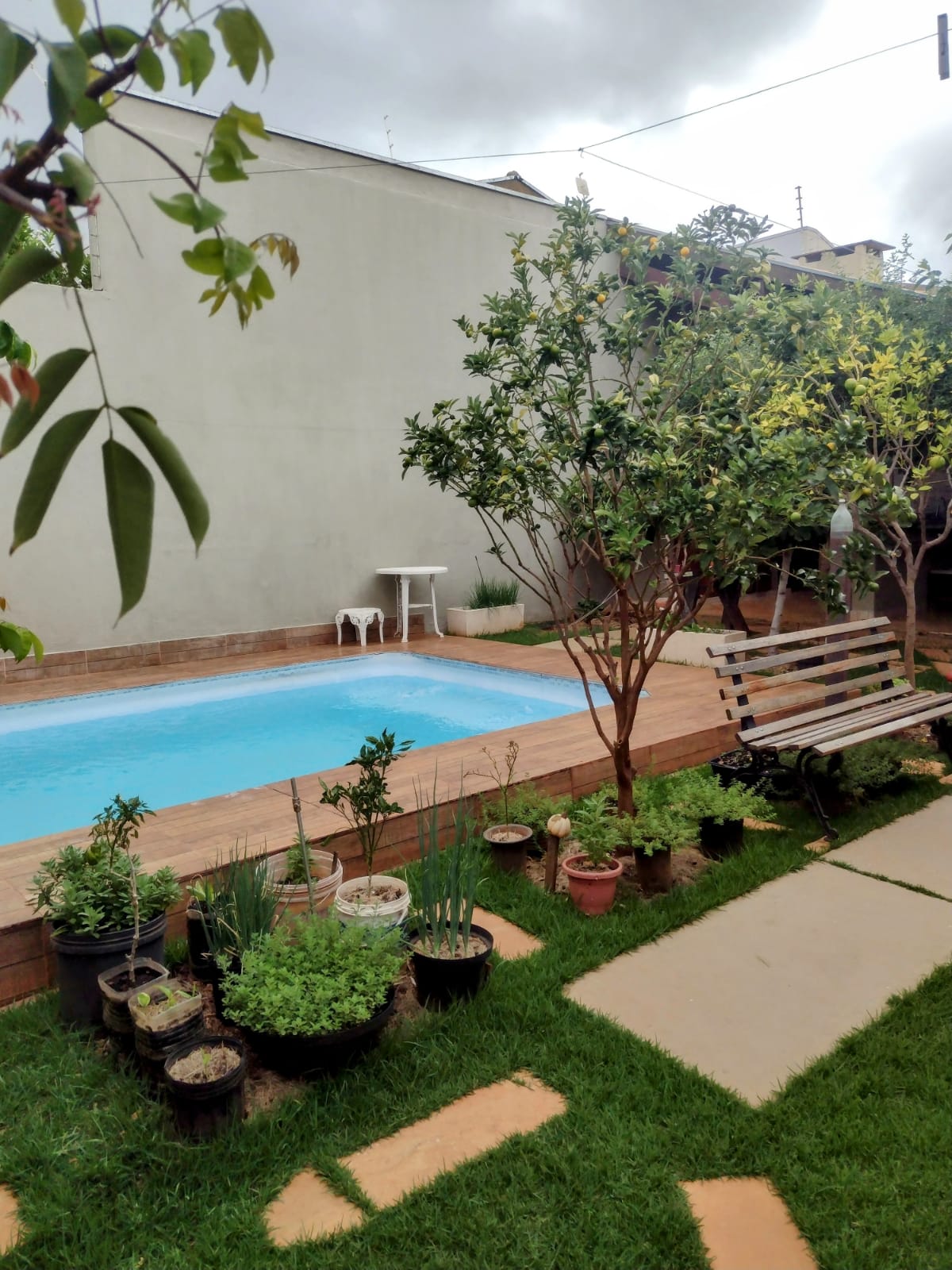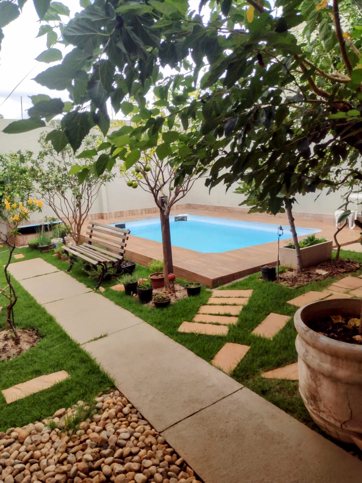piscina com árvores frutíferas ao redor;